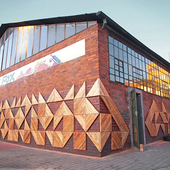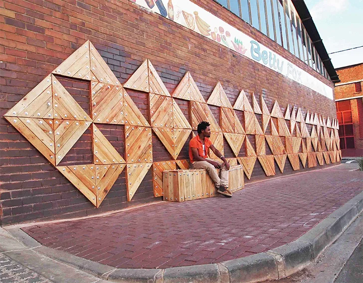 As this early XXth century warehouse was being reconverted into a grocery and restaurant, we looked at ways to transform a long brick facade, which was covered by graffitis, into a creative interface. We worked with people in the neighbourhood to install and even document the installation of this project (see video below filmed by local resident Jabu Kwela), and sourced a maximum of local materials (for example, the reclaimed wood was sourced from local informal businesses).